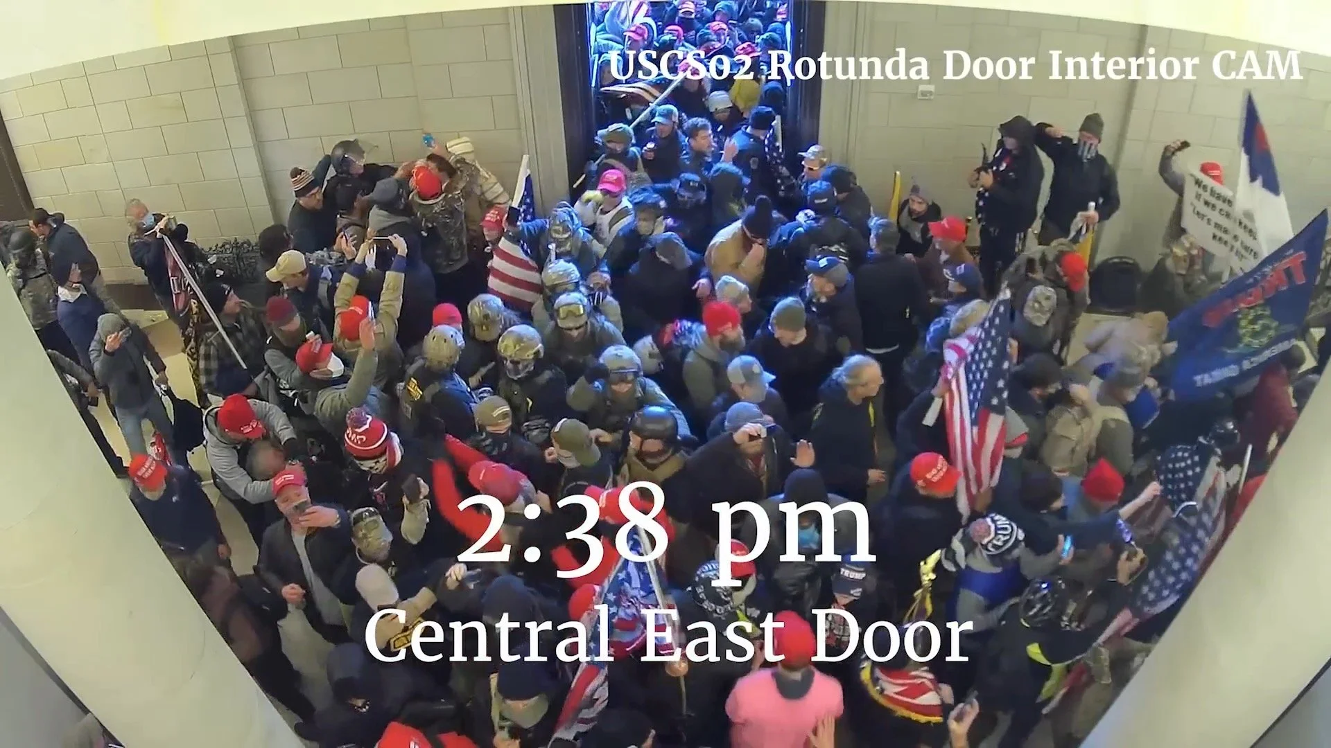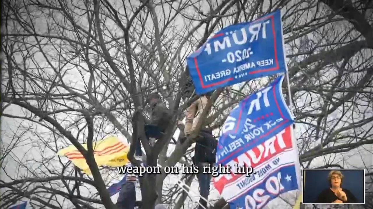 Footage shown in the sixth January 6 Committee hearing. The subtitle is from police radio transmissions in which Metropolitan Police Department (MPD) officers informed each other of the armed threats present.