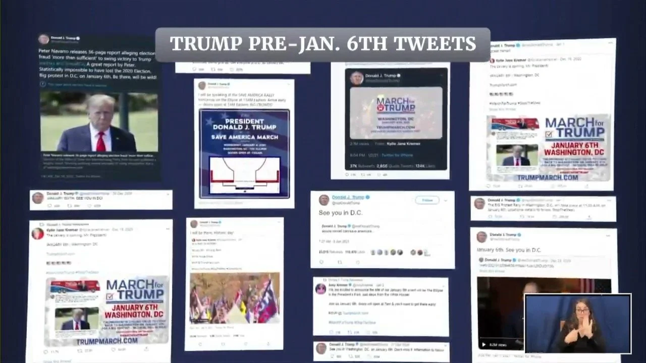 Slide showing Trump tweets leading up to January 6, 2021 from the seventh January 6 Committee hearing.