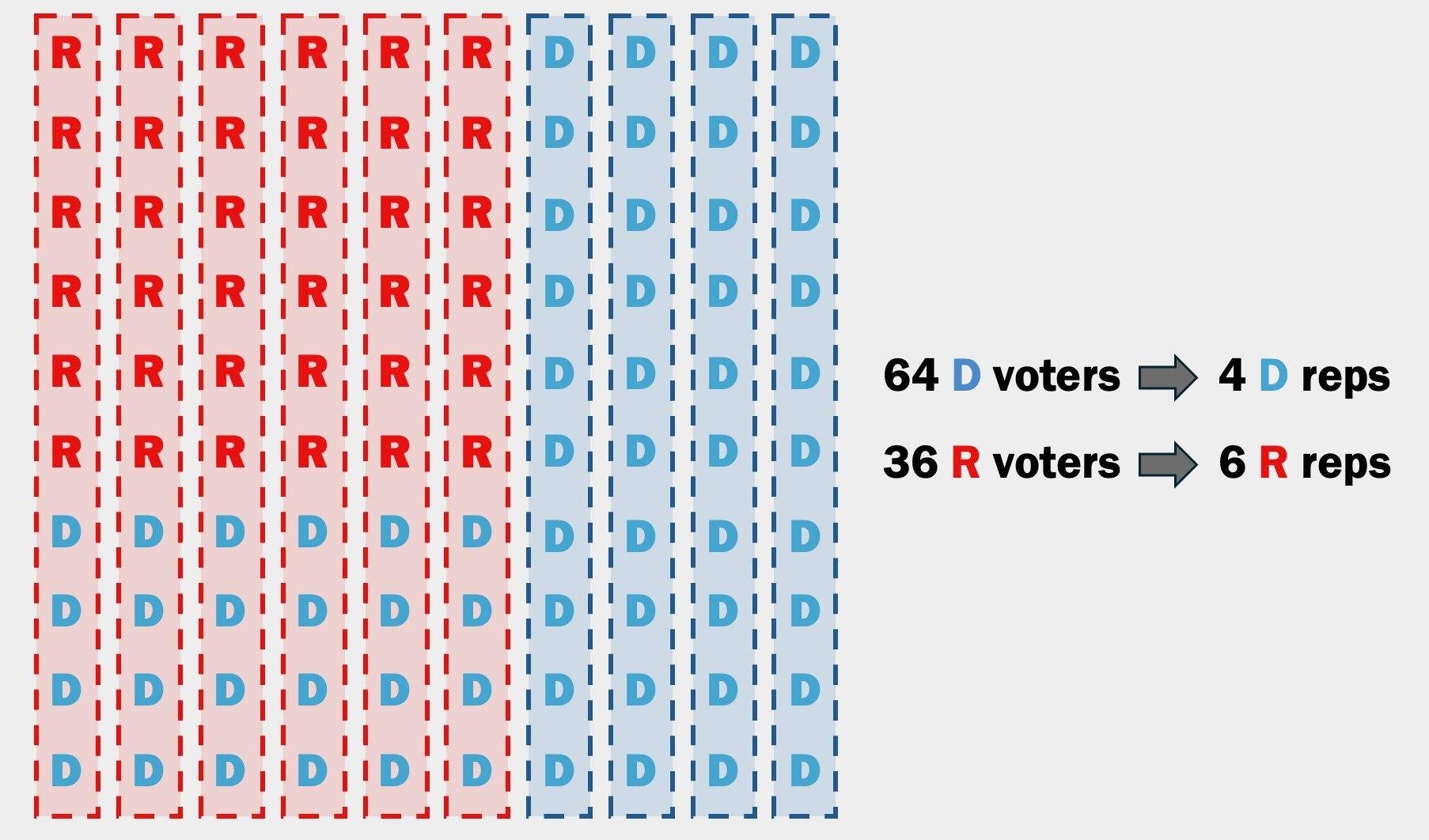 While partisan gerrymandering is not a federal crime, it is hostile to fair and equal representation in Congress and, therefore, hostile to justice itself. To see this, consider the (fictional) case of a state that has a population of 100 citizens equally partitioned into 10 congressional districts. If these districts satisfy the requirement of equal population per district within the state, then each of the ten districts will have 10 citizens. Suppose as well that the state population consists of 64 individuals who vote for Democratic candidates, and 36 who vote for Republican candidates. In that case, the state as a whole qualifies as a strongly Democratic-majority state. So, if the state’s congressional delegation were consistent with the partisan composition of the state, we would expect the state to send 6 Democratic and 4 Republican representatives to Congress.