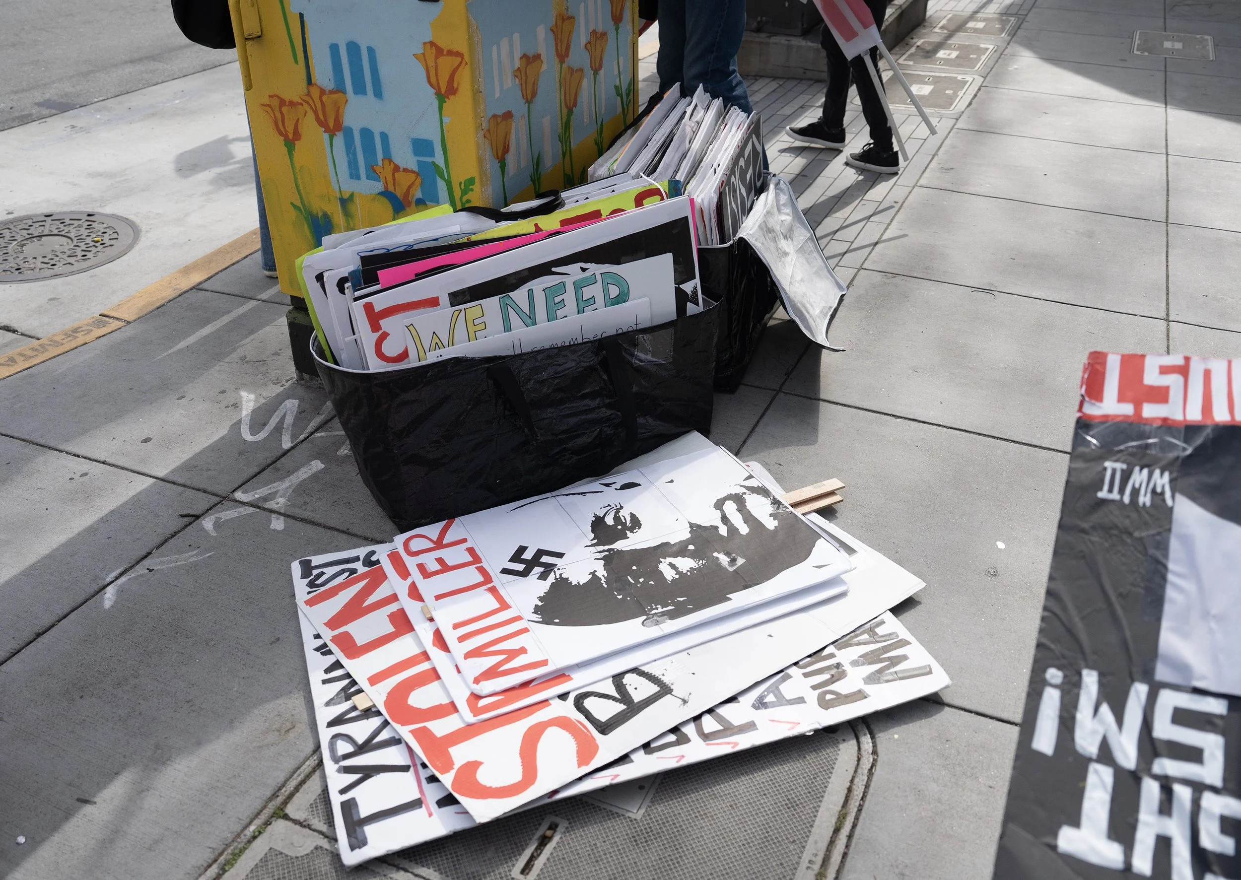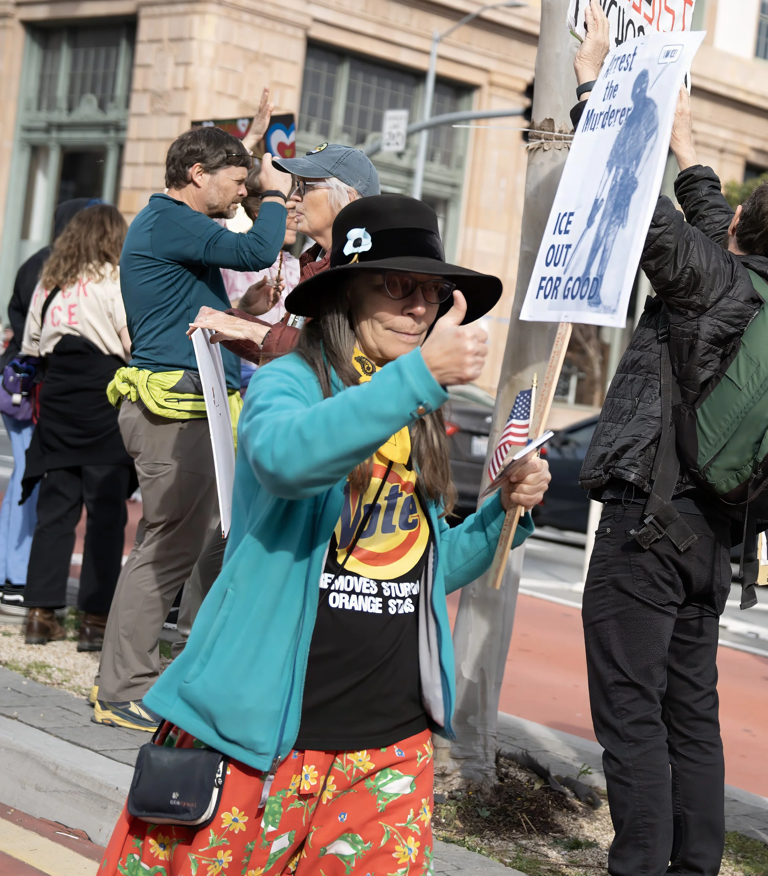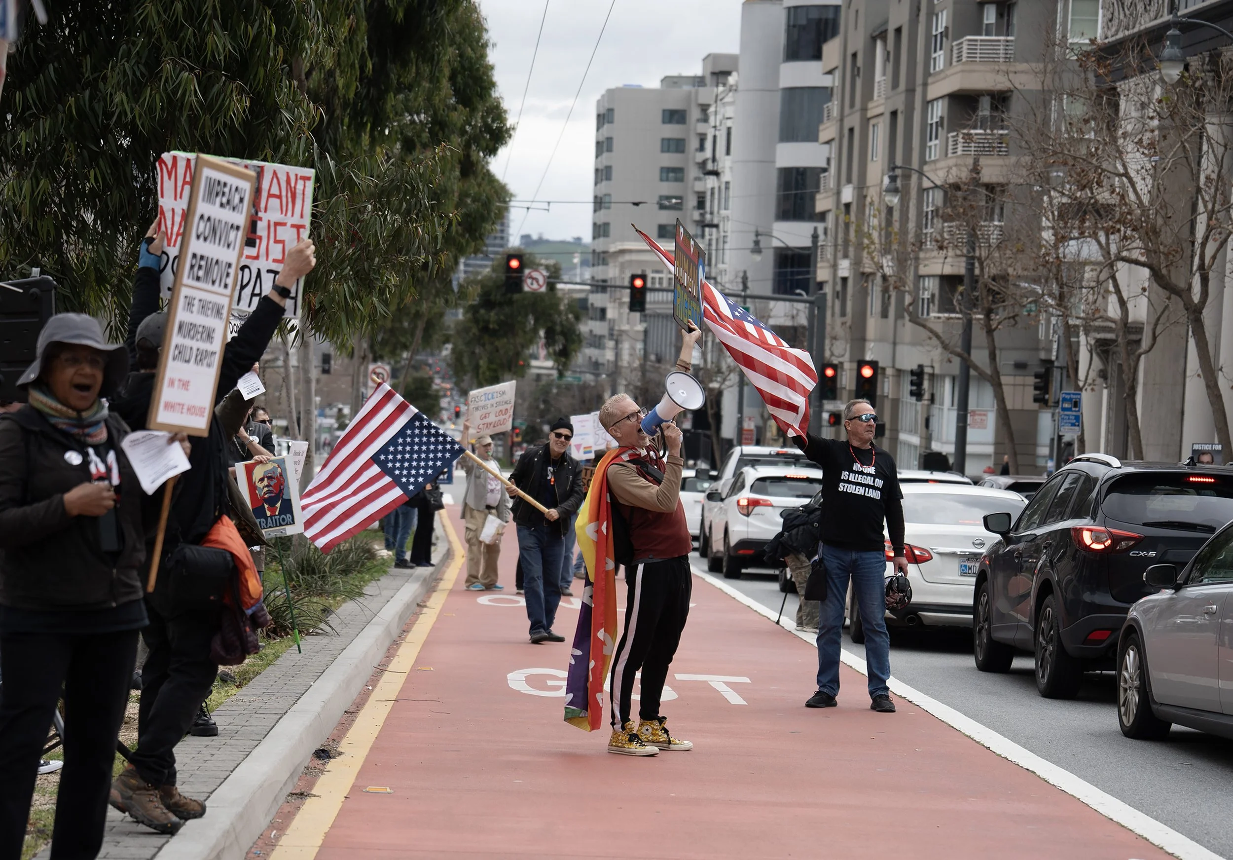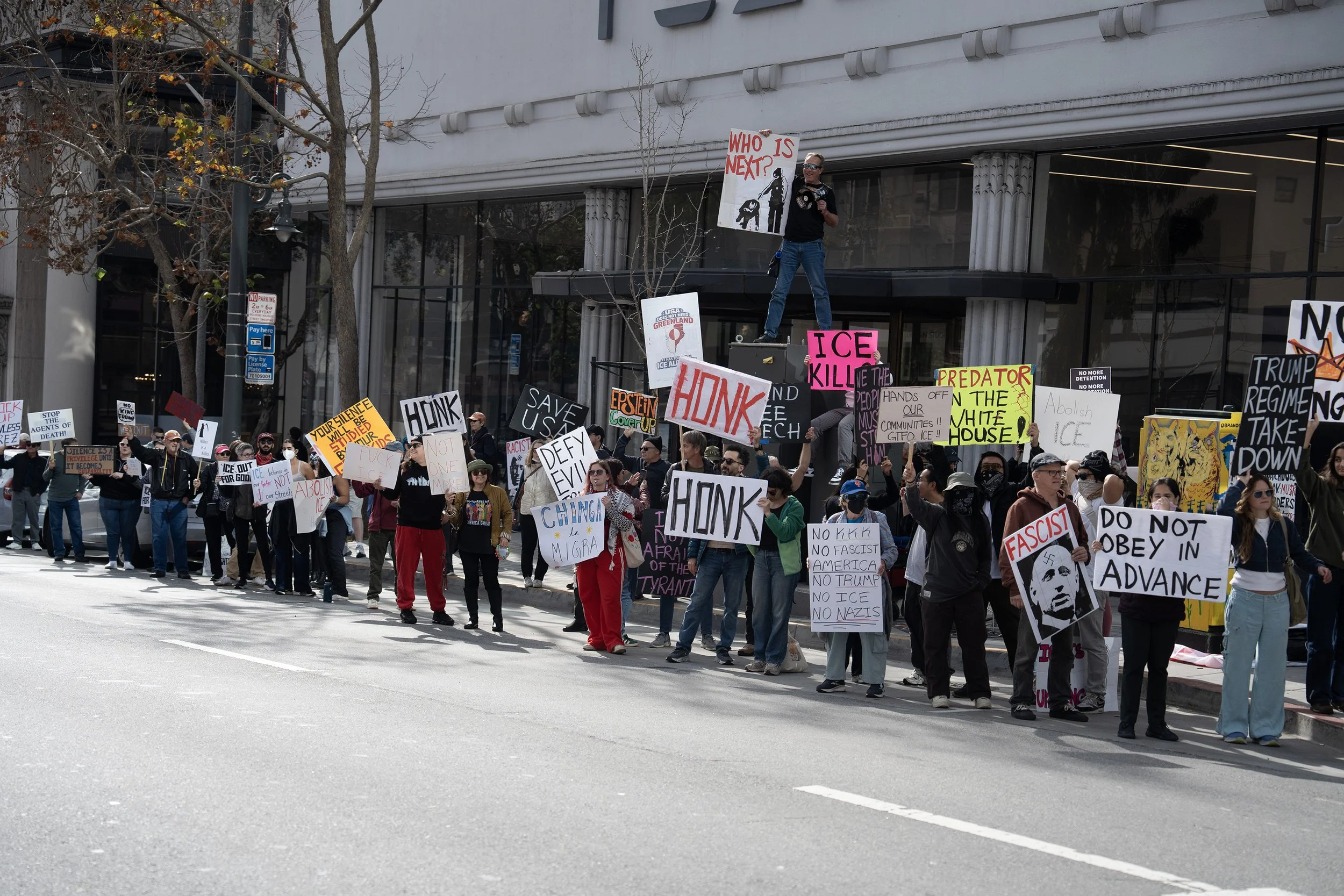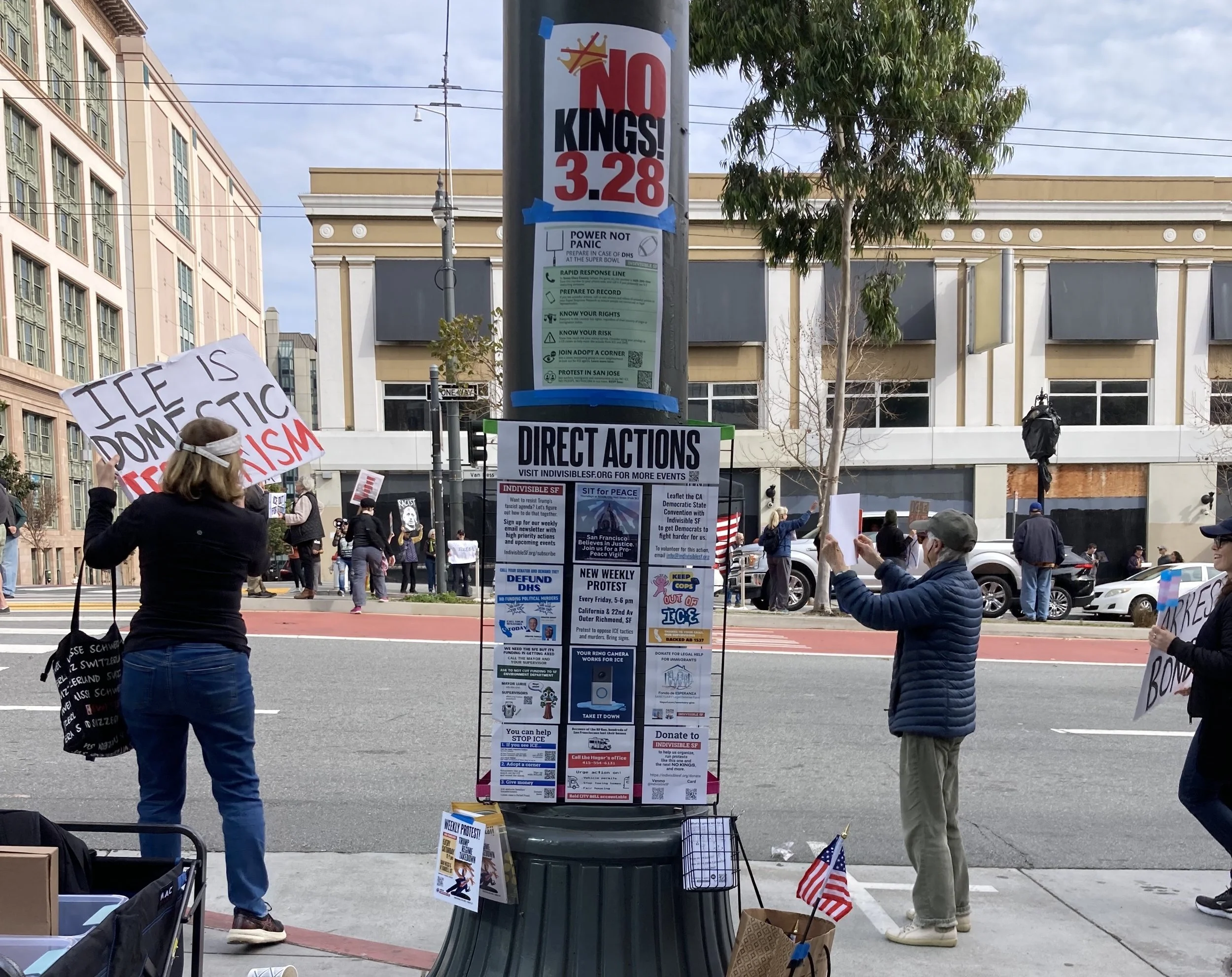 We have a strong community of regular protesters who commit to showing up every week. We are visible examples of resistance and we provide that spark of hope. The response from drivers is incredibly positive so it’s a very cathartic experience. We get a constant stream of honks and waves and fists in the air from drivers, Muni operators, truck drivers, tour buses, tourists in Waymos, you name it. Everyone is happy to see us out there and actively protesting against this Administration.