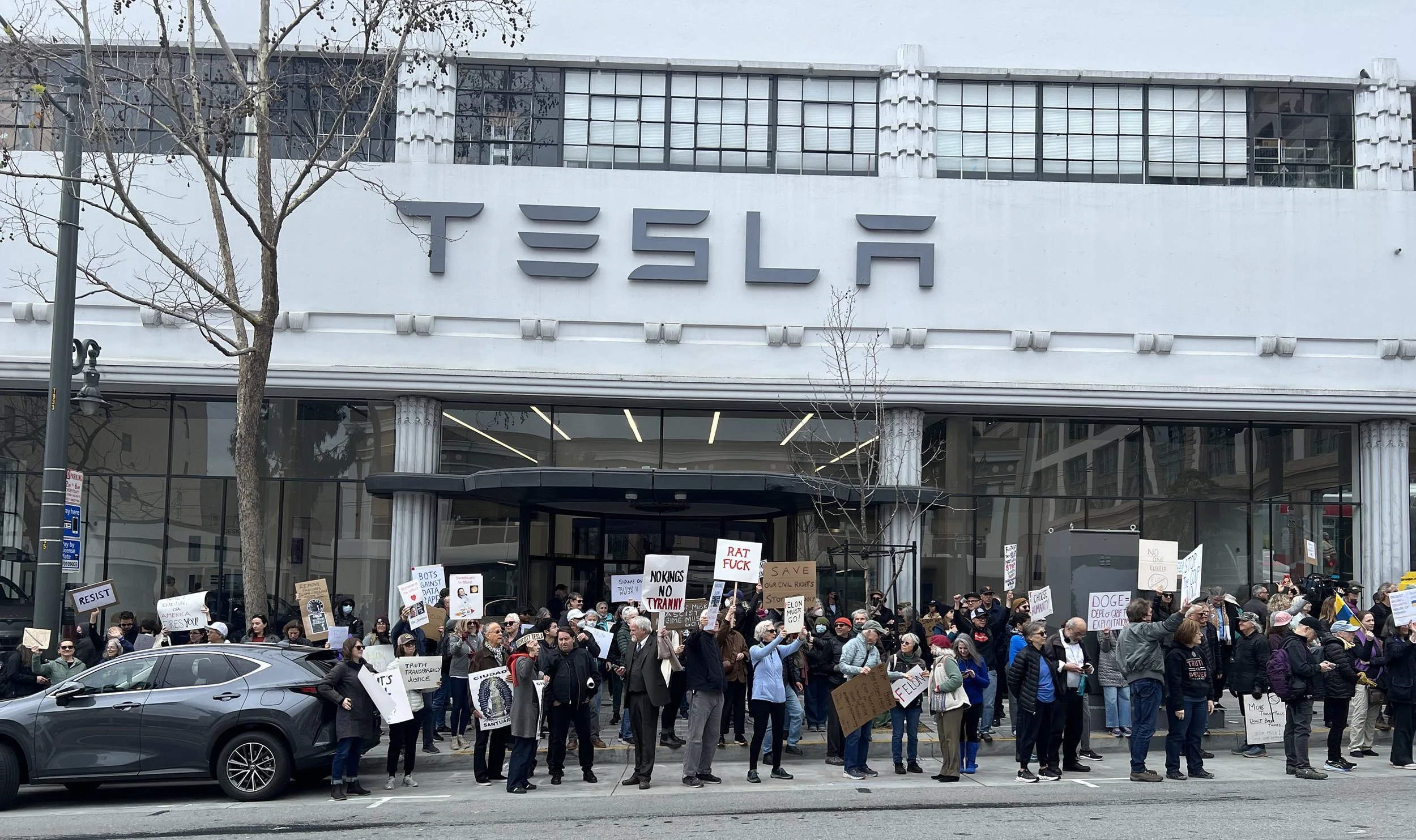 The nationwide Tesla Takedown movement started in February 2025 with protests spontaneously appearing outside of Tesla showrooms across the country, in direct response to attempts by Elon Musk to dismantle large parts of the federal government with DOGE, the so-called Department of Government Efficiency. In San Francisco, fitness instructor Patty Moddelmog quickly organized a protest in front of the SF Tesla showroom on February 17 and continued to host it on a weekly basis through May.