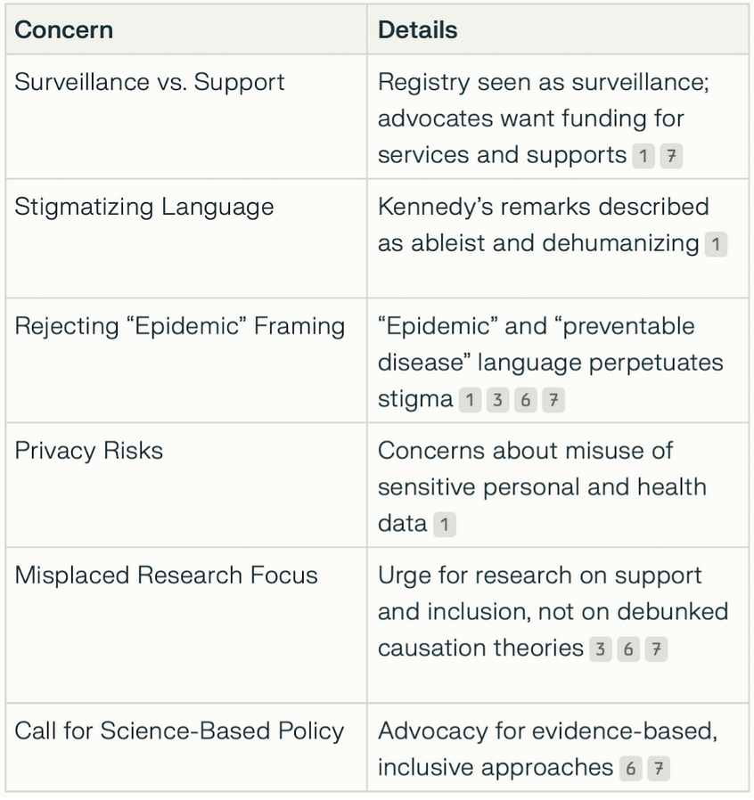 Focus on Surveillance, Not Support: Advocates argue that the registry represents a “surveillance-style data collection” approach that diverts resources from what autistic people actually need—such as funding for home care, accessible education, and individualized services. They emphasize that investment should go toward supporting autistic individuals rather than tracking or pathologizing them[1].
