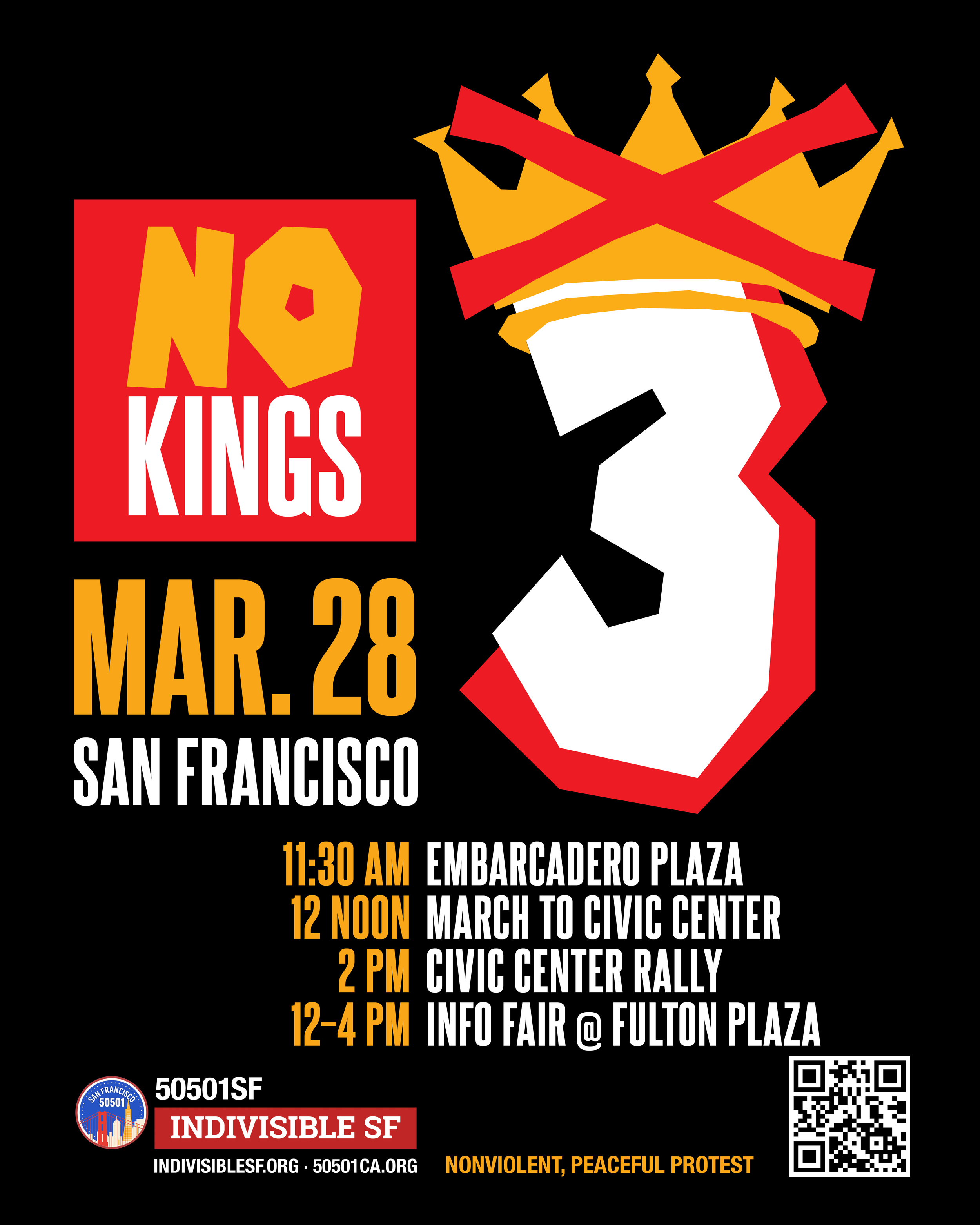 No Kings 3 San Francisco is a collaboration between Indivisible SF and 50501SF, with additional support from ACLU of Northern California.